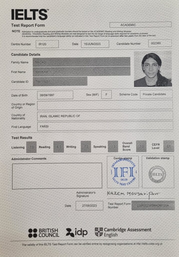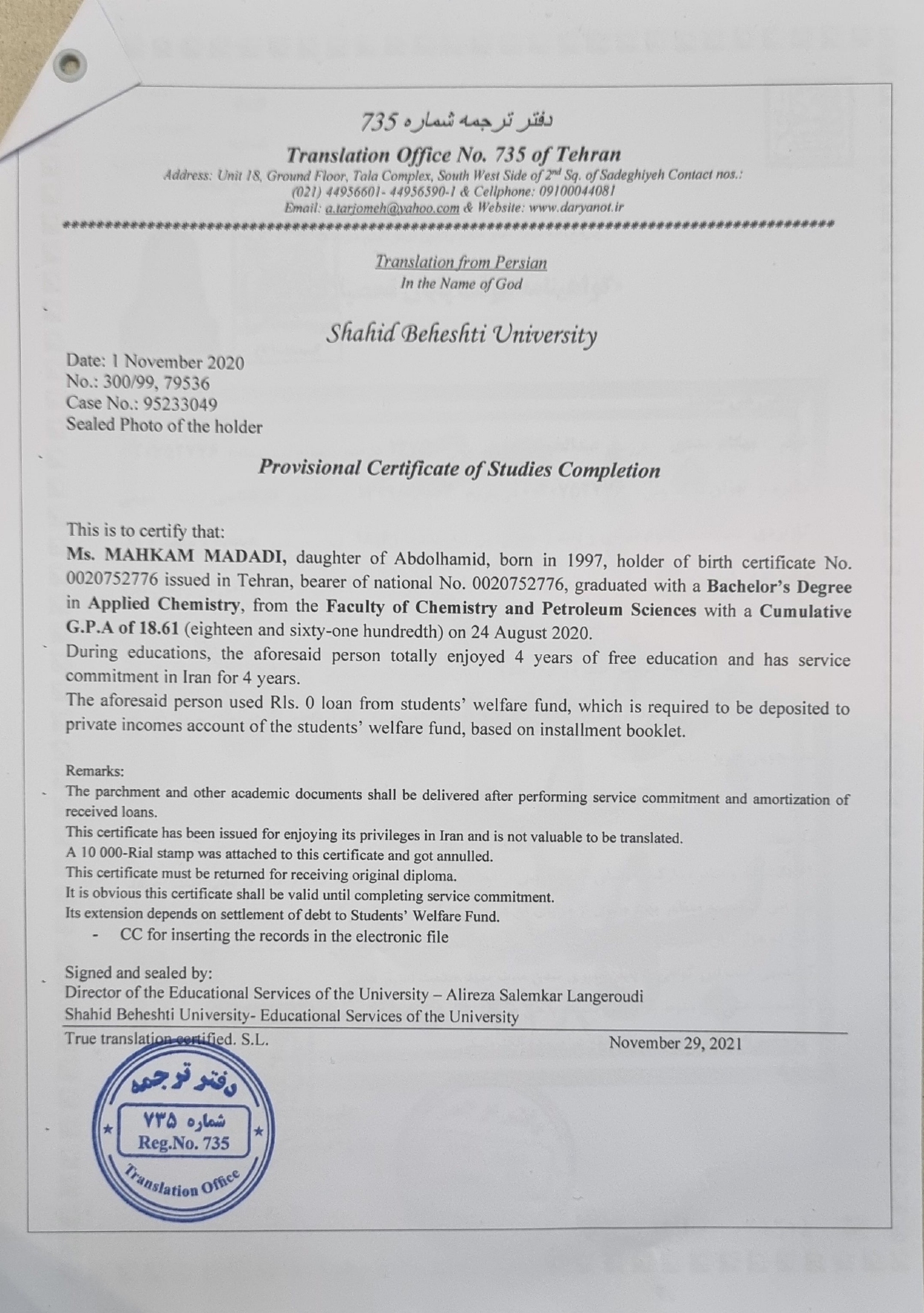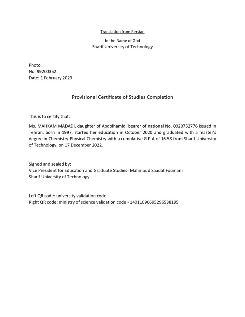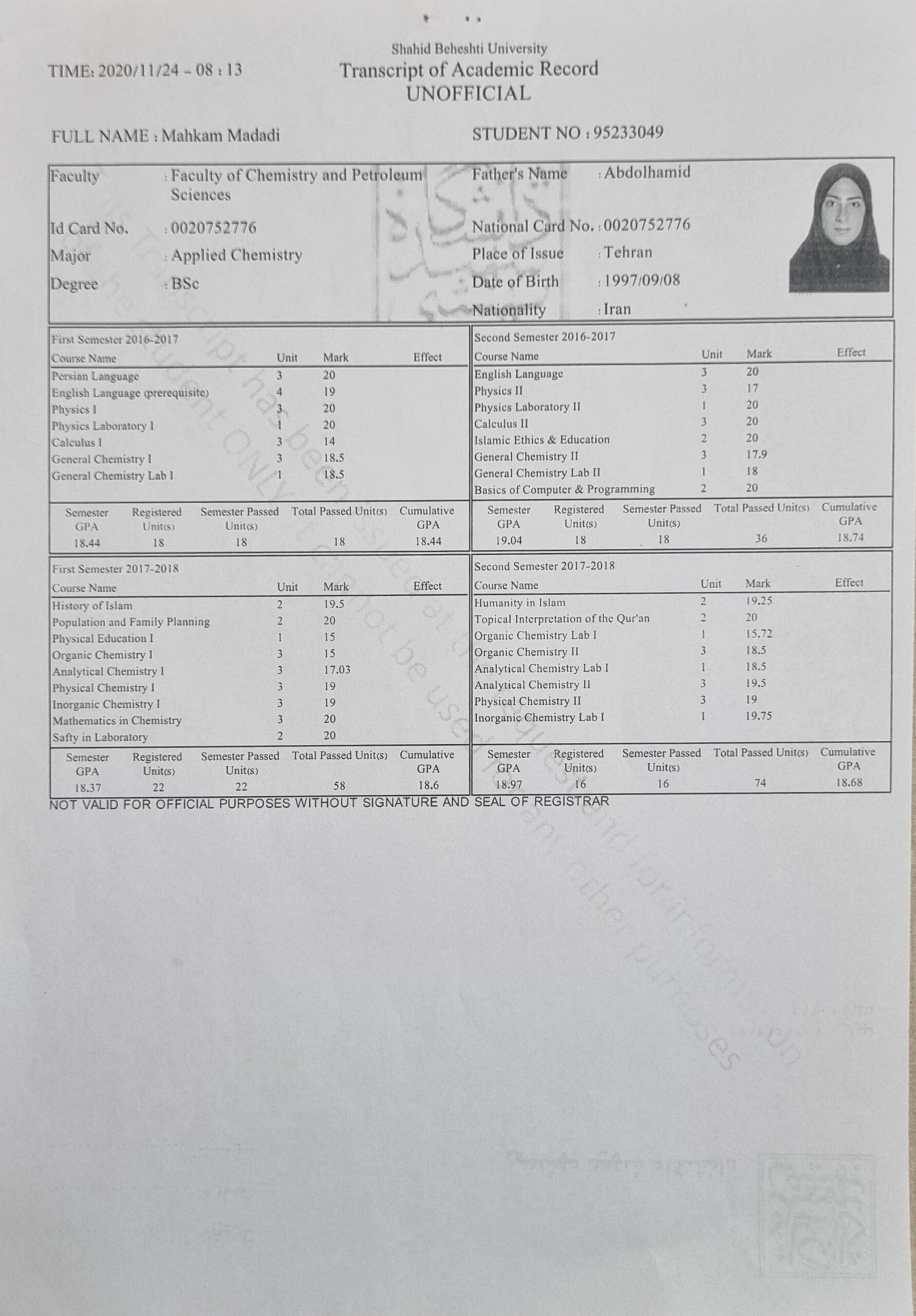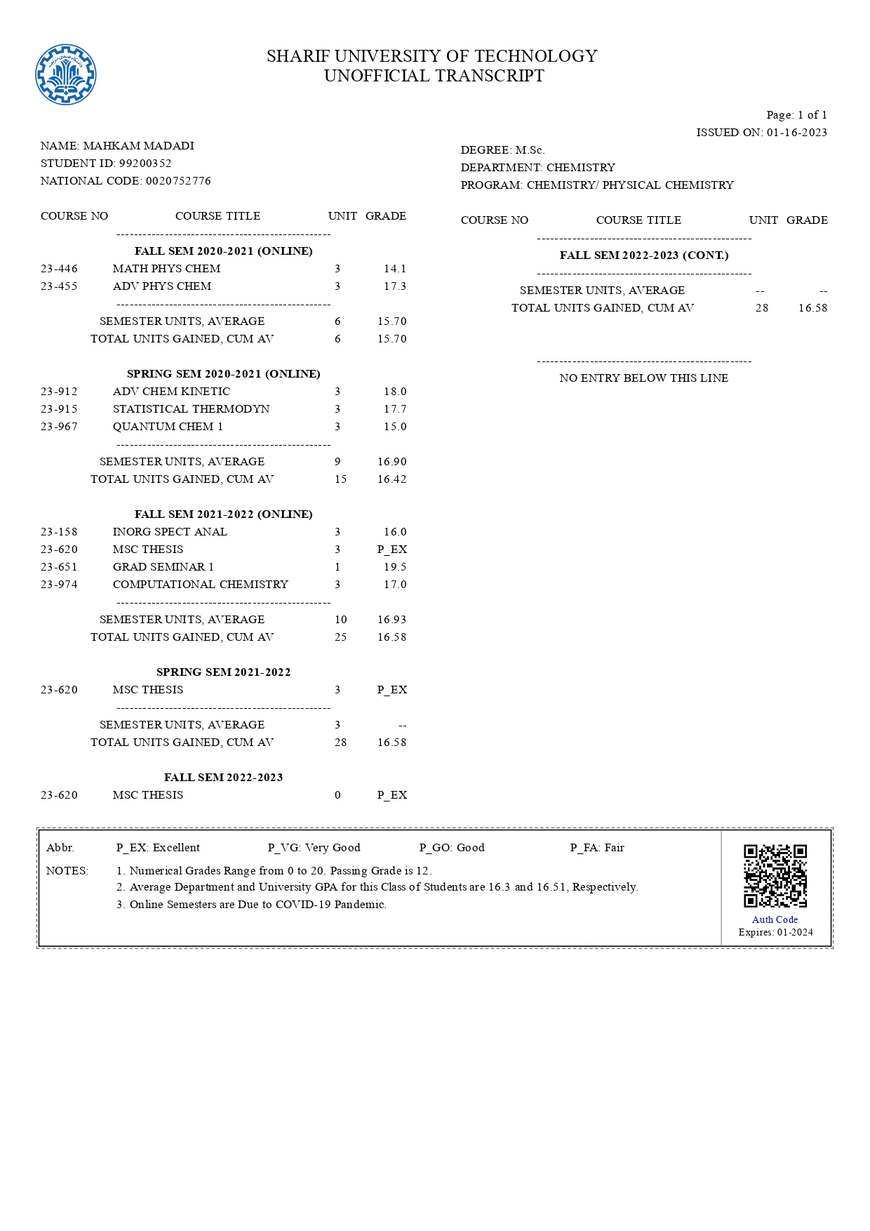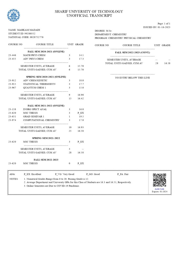 Grade Point Average = 16.58 per 20 (Honor Student)