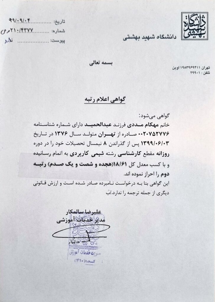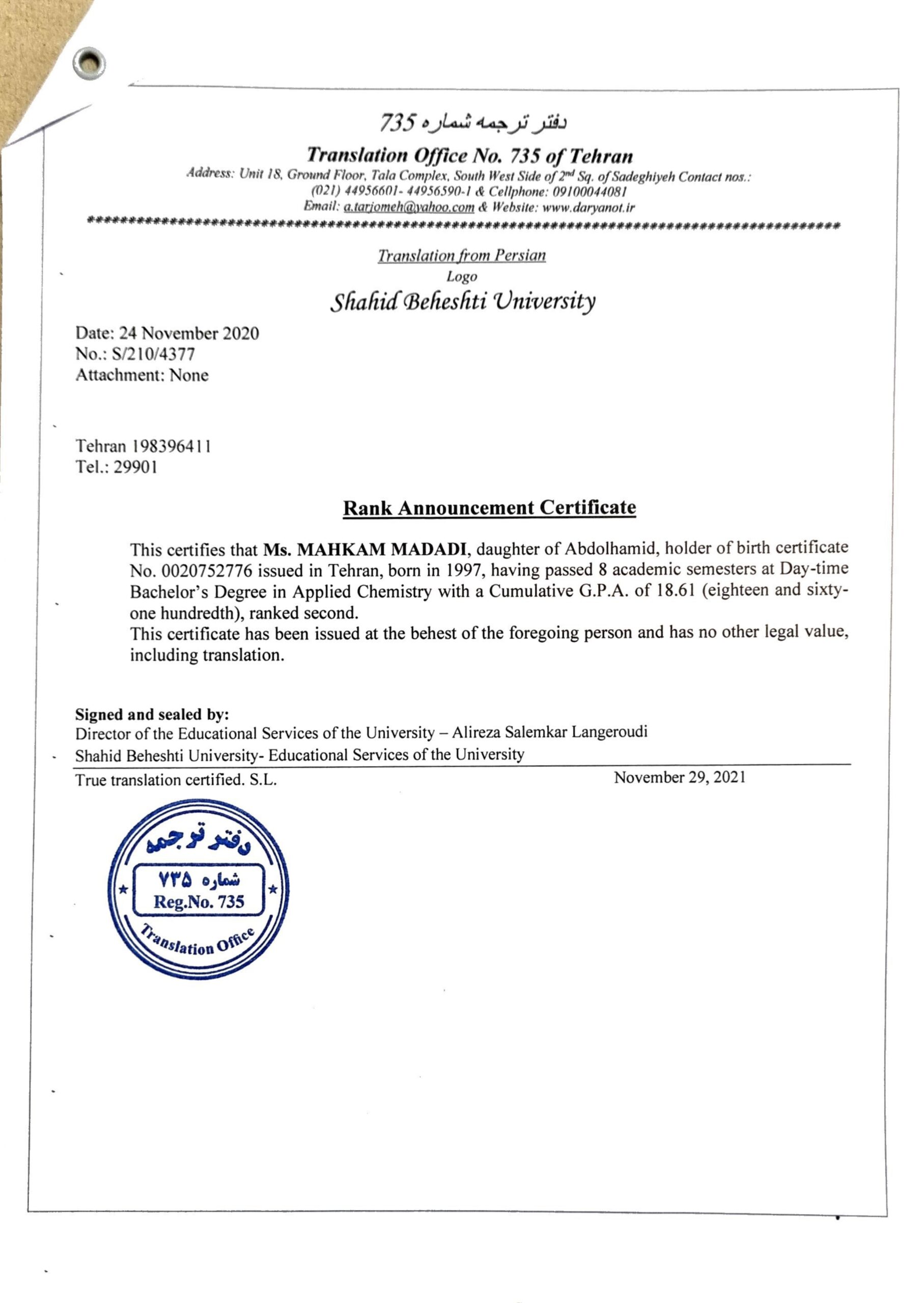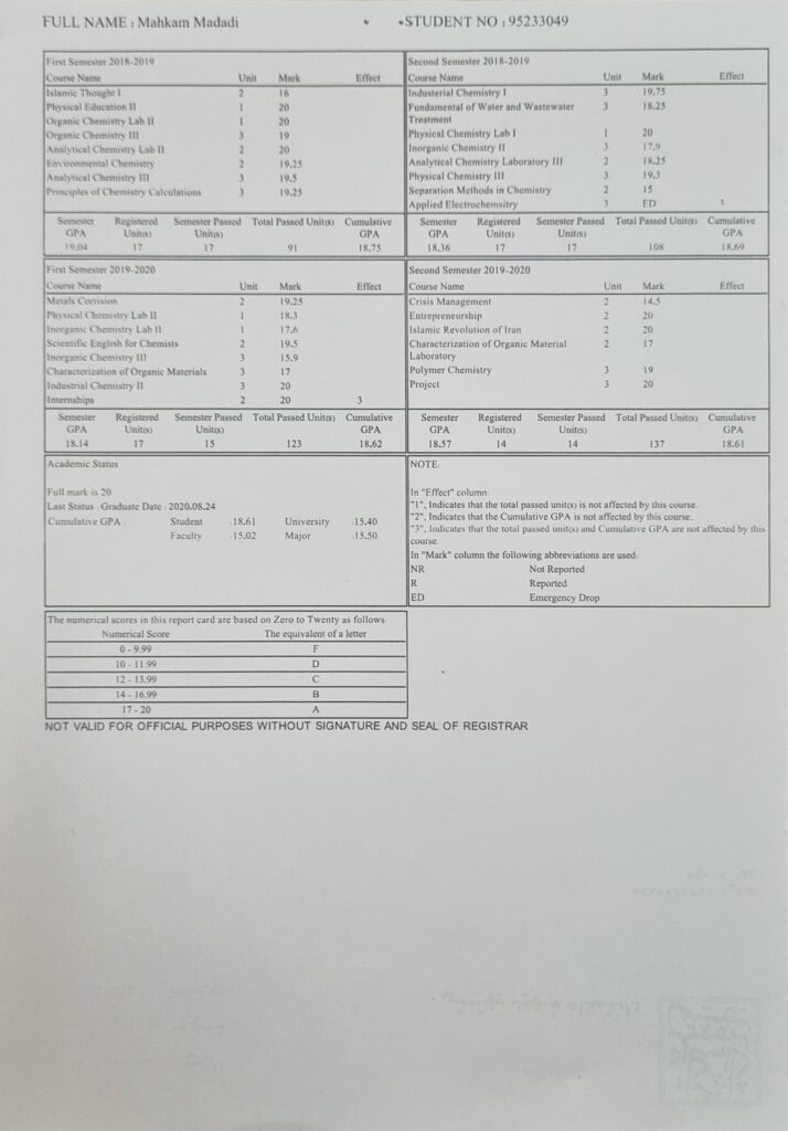 Grade Point Average = 18.61 per 20 (Honor Student)